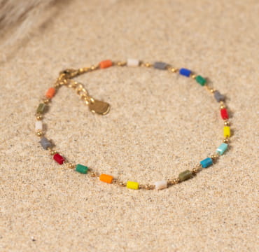 Notre bijou Tropéa, un bracelet de cheville colorés confectionné avec de petites perles en verre rectangulaires. Pour une parfaite association, optez pour notre collier pour femme, et bracelet. Retrouvez aussi ce bijou de cheville Tropéa en argenté.