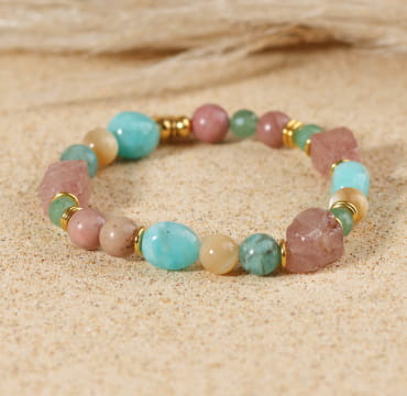 Pour un style coloré, retrouvez notre bracelet pour femme Bérénice. Avec ses perles naturelles en amazonite et aventurine vertes, en quartz et rhodonite rose et en nacre, ce bracelet ajoutera une touche de douceur et de lumière à votre tenue !
