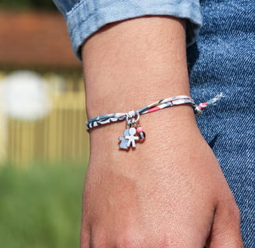 Offrez à votre mamie un bracelet personnalisable en tissu multicolore et ajoutez le nombre de petits personnages de votre choix : filles ou garçons (jusqu’à 4 maximum).