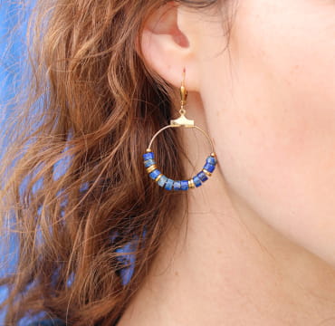 Découvrez nos boucles d’oreilles Heishi, une paire de boucles d’oreilles dorée et bleues. Ses perles en lapis lazuli de couleur bleue et dorée vous transporte en pensée aux abords de nos longues plages. Ce bijou femme est agréable à porter tous les jours ou pour une occasion spéciale. L’attache créole apporte à ce bijou une touche délicate et aérienne : accordez facilement vos tenues !