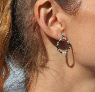 Retrouvez l’une de nos paires de boucles d’oreilles argentées Sormiou. Un bijou fait main avec de jolies petites perles en amazonite, hématite et turquoise africaine donnant des tons verts, aléatoire selon les perles utilisées.