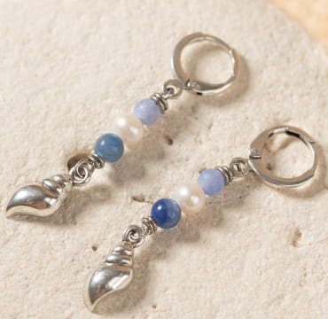 Zynou, des boucles d’oreilles longues inspirés par le bord de mer apporteront une touche ludique grâce à leurs petits pendentifs en forme de coquillage. Les perles en agate, nacre et aventurine, quant à elles, apportent une touche naturelle.