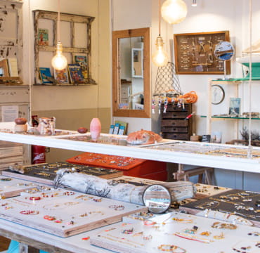 Notre boutique à l’esprit brocante de bord de mer déploie une large gamme de bijoux soigneusement pensés et confectionnés à la main, sur des tables chinées, au milieu de filets de pêche, de flotteurs colorés.