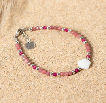 Avec sa perle principale en nacre et ses petites perles en ruby rouge, et rhodonite rose, ce bijou est idéal pour vos tenues estivales.