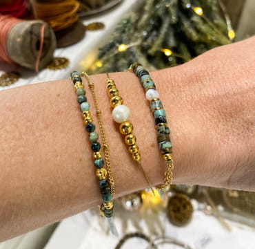 Cumulez à vos poignez Marquise et Alchimie, petites pépites de couleurs en turquoise africaine ou lapis Lazuli, avec leurs perles et des chainettes à grains. Tout en délicatesse.