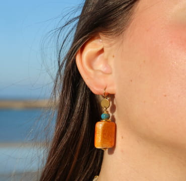 Nos boucles d’oreilles Toulon composées de perles cubiques en céramique est aussi un bijou à porter cet été pour fêter de beaux événements ! Ajoutez également notre collier Toulon pour apporter plus d’originalité.