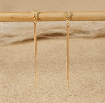 Notre paire de boucles d’oreilles Adrienne, composées de délicates petites chaînes dorées sont parfaites pour accessoiriser votre tenue pour les fêtes. Cette paire de boucles d’oreilles pour femme est aussi une belle idée de cadeau.