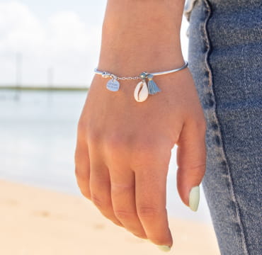 Nos bracelets sont imaginés pour répondre à votre style, déclinés dans de multiples coloris selon votre personnalité, comme le jonc Amélie argenté sublimé par son pompon bleu. Il existe également en doré, avec son pompon blanc, et sont tous deux composés d’un coquillage.