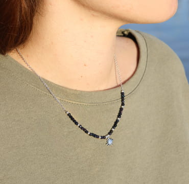 Découvrez notre collier en pierre de sable bleu marine Binibeca : un bijou délicat, parfait à porter près de soi pour toutes les occasions. Ce collier pour femme se porte très bien avec une tenue décontractée que chic. Son pendentif en forme d'étoile rappelle le bord de mer avec ses nuances de bleus.