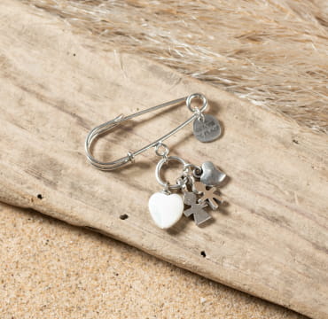 Cette broche personnalisable est composée de charmants pendentifs en forme de cœur en métal plaqué argent 999 et en nacre blanc ornée de petits personnages.