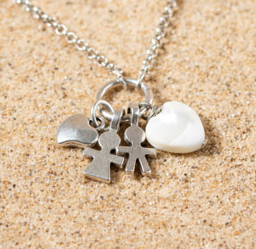 Optez pour notre collier personnalisable Famiglia, un bijou monté sur une chaîne en métal plaqué argent 999 composé de pendentifs en nacre blanche et ses petits personnages.