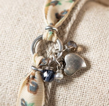 Ce bracelet argenté, en lin, avec un cordon en tissu liberty est un bijou pensé pour vos mamans. Son pendentif en forme de cœur et les petites perles en verre viennent apporter une touche délicate.