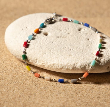 Le bracelet de cheville Tropea séduit par ses perles rectangulaires multicolores. Ce bijou coloré, inspiré par la gaieté de l’été, s’accorde avec toutes les tenues et apporte une touche de bonne humeur.