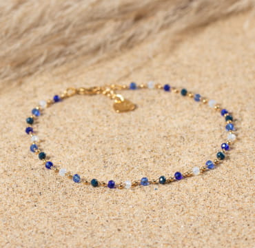Composé d’une chaîne dorée à l’or fin 24 carats, et de petites perles en verre de couleurs bleu, ce bijou apportera une touche colorée et élégante.