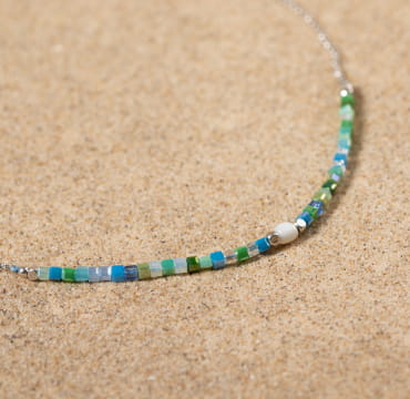 Murzo notre collier aux nuances de verts et de bleus (aussi disponible en doré multicolore) vous plongera dans vos doux souvenirs de vacances le long de la côte Ouest. Composé à la main par nos monteuses en bijoux, ce bijou est conçu avec de petites perles en verre et nacre blanc sur une chaîne en métal plaqué argent 999. Composez votre parure de bijoux avec notre paire de boucles d’oreilles et notre bracelet Murzo.