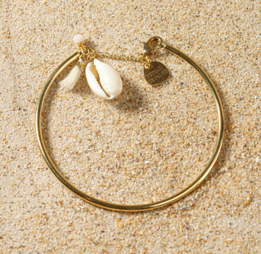 Amelie, notre emblématique bracelet jonc pour femme est un bijou à associer avec son collier et ses boucles d’oreilles Amelie. Aussi disponible en bleu, ce bracelet femme fantaisie se compose d’un joli jonc doré à l’or fin, d’un petit coquillage, d’un pompon beige et d’une petite perle blanche.