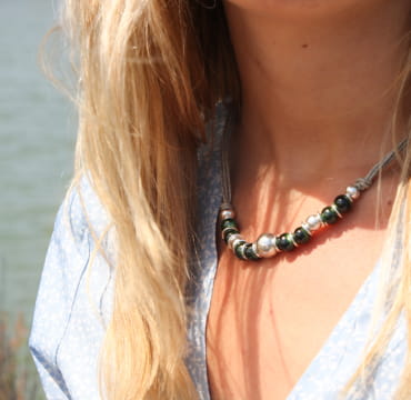 Admirez les belles couleurs de ce collier femme en perles Massy. L’éclat des perles en céramique de couleur vertes ainsi que le cordon en lin reflète les belles matières le long de nos côtes.