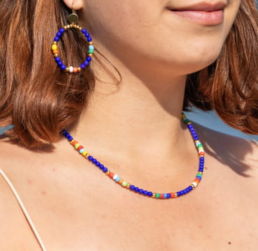 Imaginés par nos créatrices dans l’île d’Oléron puis confectionnés à la main par nos monteuses en bijoux, nos colliers apporteront une touche lumineuse et colorée pour passer vos vacances au bord de l’eau.