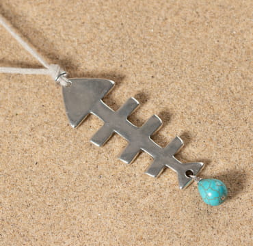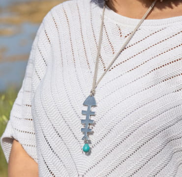 Retrouvez dans nos boutiques et sur notre e-shop notre sautoir Billy, une pièce unique fabriqué sur un cordon en lin, puis sublimé par une petite perle en howlite bleu turquoise et un pendentif en forme d’arête de poisson.