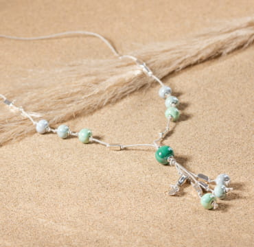 Dans les mêmes tons, notre bijou Sepia, un sautoir en lin composé de perles en céramique dans de jolies nuances de verts est idéal pour apporter de la couleur à votre tenue.