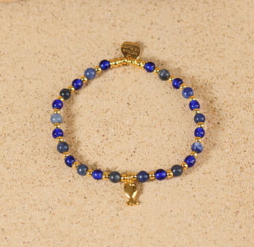 Le bracelet Alexia met à l’honneur le joli bleu des perles de sodalite et de verre. Ces perles bleues s'allient avec le petit pendentif en forme de poisson et ses perles dorées. Un joli bijou ispiré par le bord de mer !