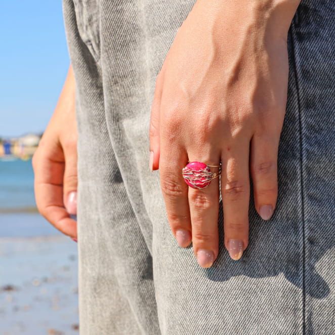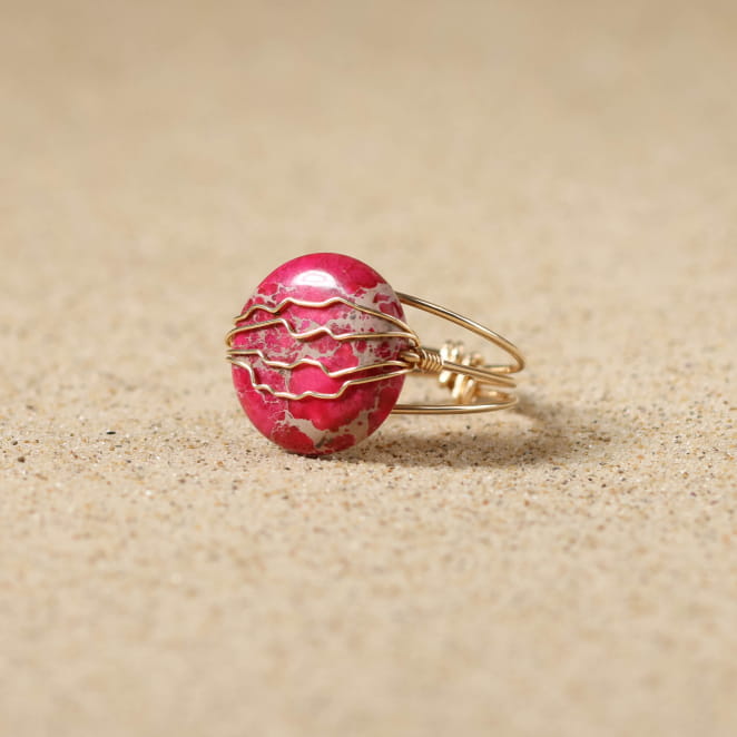 La bague Oléronaise, ornée d'une perle en jaspe impérial est sublimée par un fil gold filled doré, symbolisant protection et beauté. Élégante et raffinée, elle est parfaite pour toutes les occasions, apportant une touche de sophistication à votre tenue. L'association du doré lumineux et de la jaspe impérial rose confère à cette bague un charme classique et moderne à la fois. Fabriquée avec soin, elle incarne l'essence de la simplicité chic, célébrant le mariage harmonieux des matériaux de qualité et du savoir-faire artisanal. Un véritable trésor à porter au quotidien.