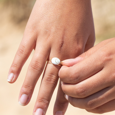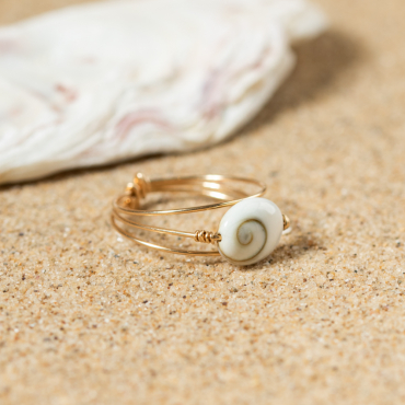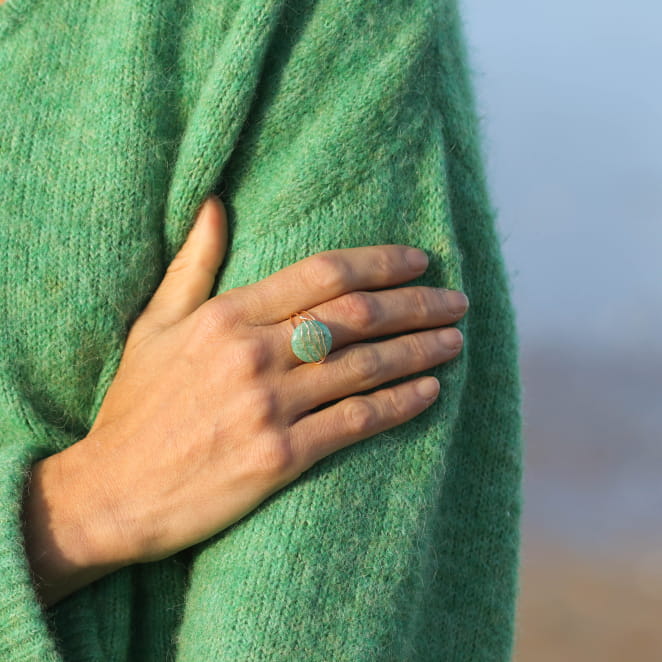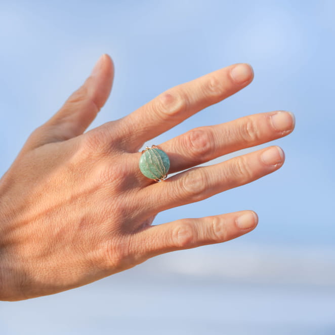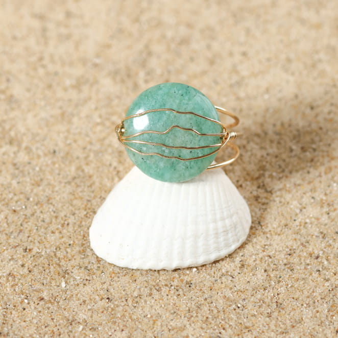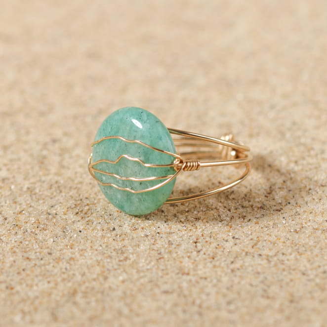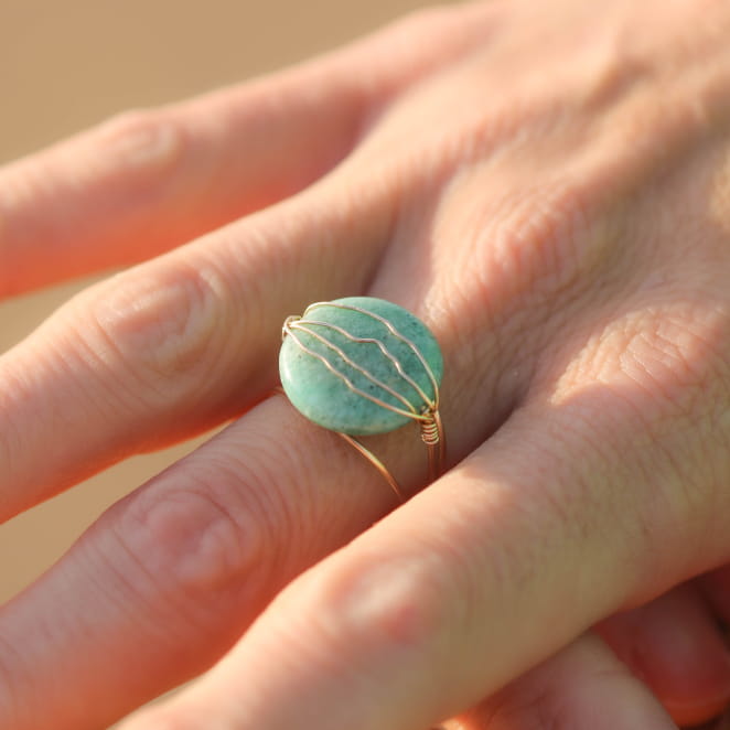 La bague Oléronaise, ornée d'une perle en amazonite est sublimée par un fil gold filled doré, symbolisant protection et beauté. voir plus