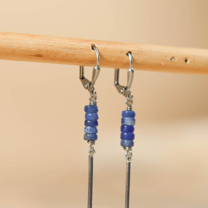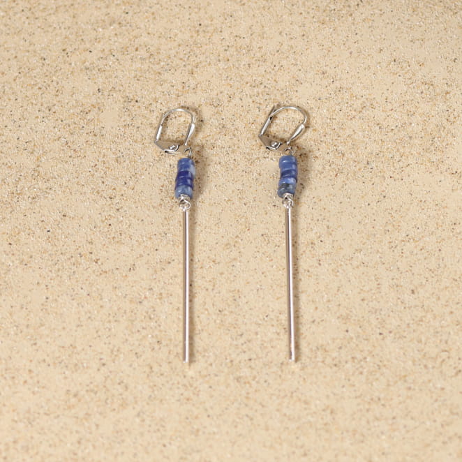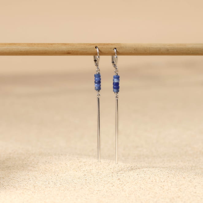 Réveillez votre style avec les boucles d’oreilles pour femme Batam, une création délicate où un pendentif en forme de bâton s’associe à des perles en sodalite bleu aux reflets doux et naturels. Ce bijou évoque les jolies couleurs du bord de mer. Les perles en sodalite, apporte une touche de sérénité, tandis que lependentif argenté ajoute une touche de modernité. Légères et pleines de poésie, ces boucles d’oreilles sont parfaites pour illuminer votre visage d’une lueur à la fois douce et inspirante.
