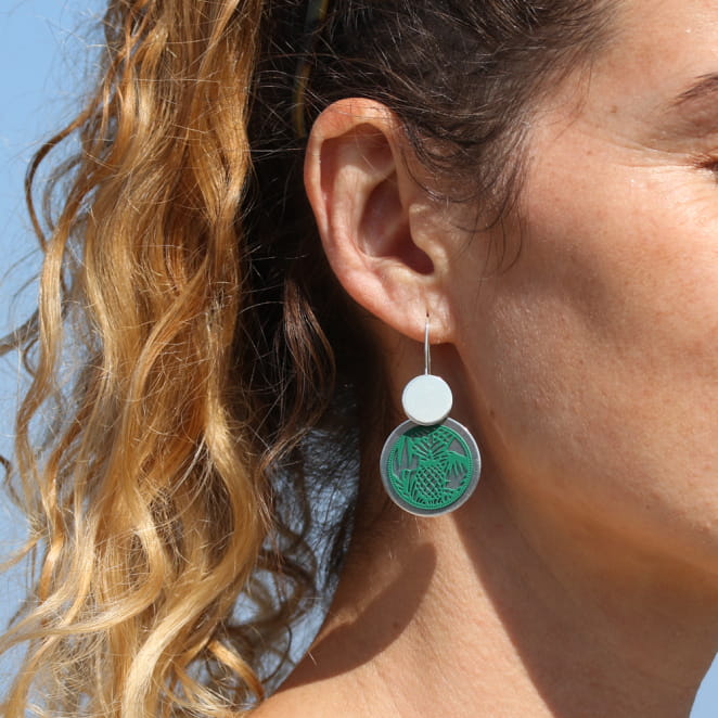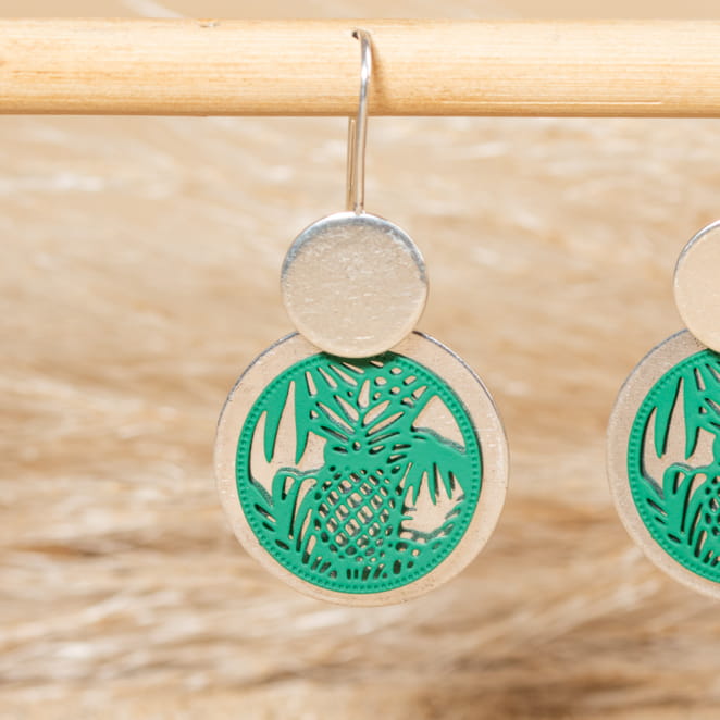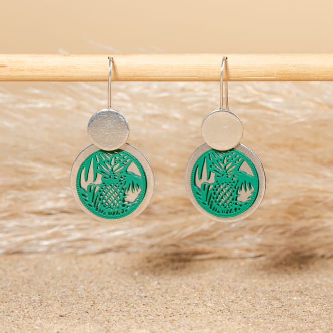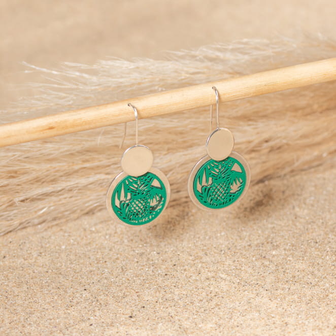 Découvrez l'éclat de nos boucles d'oreilles argentées et vert Belem. Fabriquées en France, ces boucles d'oreilles allient des pièces rondes argentées à un pendentif ajouré vert, rappelant les pins du bord de mer. Chaque détail évoque la douceur des moments au bord de l'eau, avec des teintes profondes et apaisantes. Laissez-vous emporter par ces bijoux uniques, conçus pour évoquer l'évasion et les souvenirs de vacances ensoleillées !