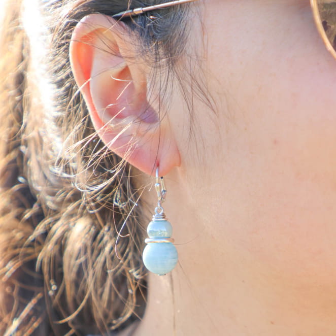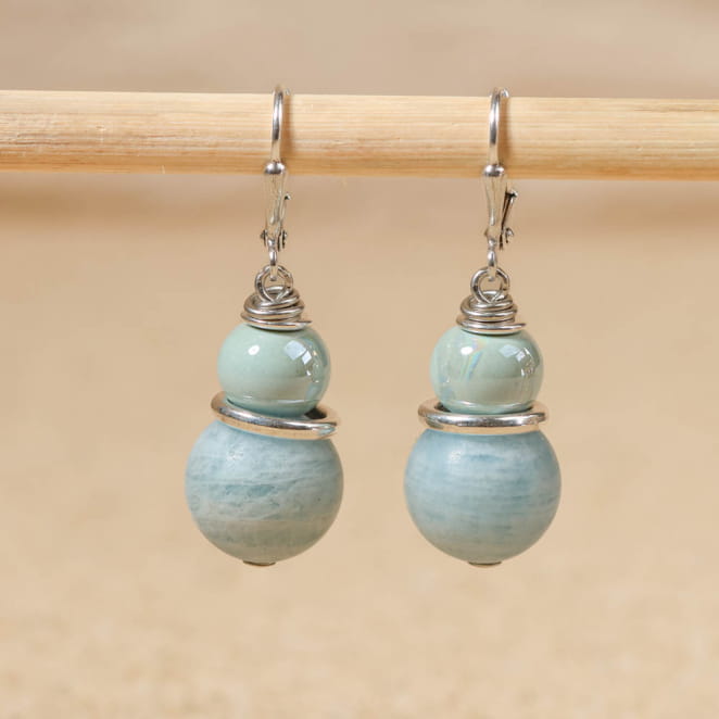 Laissez-vous séduire par l’éclat raffiné de les boucles d’oreilles Belina, où la transparence d’une perle d'aigue-marine bleu ciel rencontre la profondeur d’une perle en céramique assortie. De délicates perles argentées viennent sublimer l’ensemble, apportant une touche de lumière et d’élégance. Elles évoquent la mer et ses reflets changeants, parfaites pour illuminer votre quotidien avec douceur et poésie.