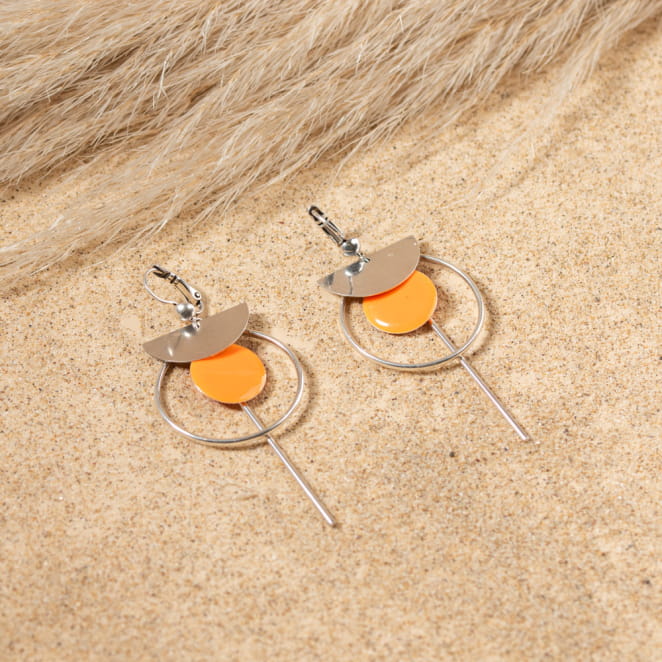 Ajoutez une touche d'élégance et de somptuosité à votre visage avec ces boucles d'oreilles Combi. Un bijou au design original et coloré avec son rond en émaille orange et en métal argenté. Une combinaison qui égayera même vos tenues les plus simples !