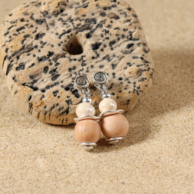 Craquez pour l’allure naturelle et sophistiquée des boucles Douhet, un bijou inspiré par les éléments. Montées sur une spirale argentée , elles associent une perle en polymère-biosourcé à une perle en céramique saumon, séparées par une rondelle argentée pour plus de relief. Ce contraste de textures : polymère, céramique et métal, crée un équilibre subtil entre matière organique et élégance lumineuse. Leur design rappelle les galets et les plages, pour un look à la fois authentique et original.