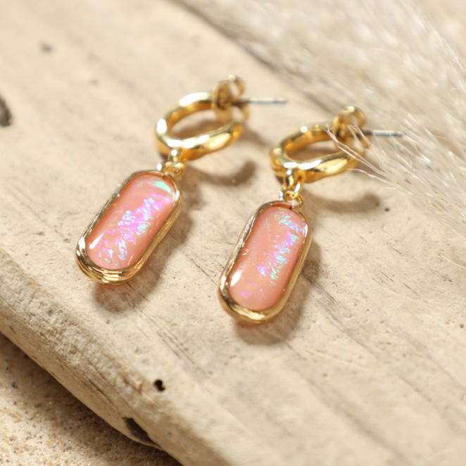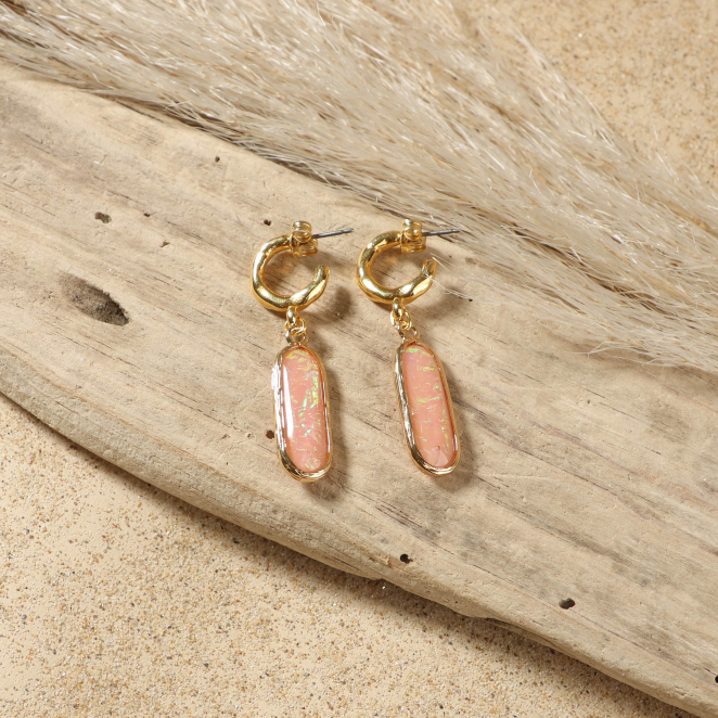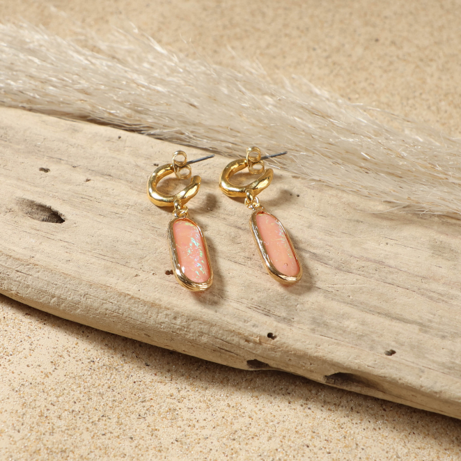 Sublimez votre style avec les créoles Galante ! Ces boucles d’oreilles, confectionnées à la main, capturent l’essence des journées ensoleillées au bord de l’eau. Leurs anneaux dorés délicats sont ornés d’un pendentif en perle rose facettée, rappelant les reflets changeants de la mer. Ajoutez une touche de fraîcheur et d’élégance à vos tenues, que ce soit pour une balade sur la plage ou une soirée estivale.