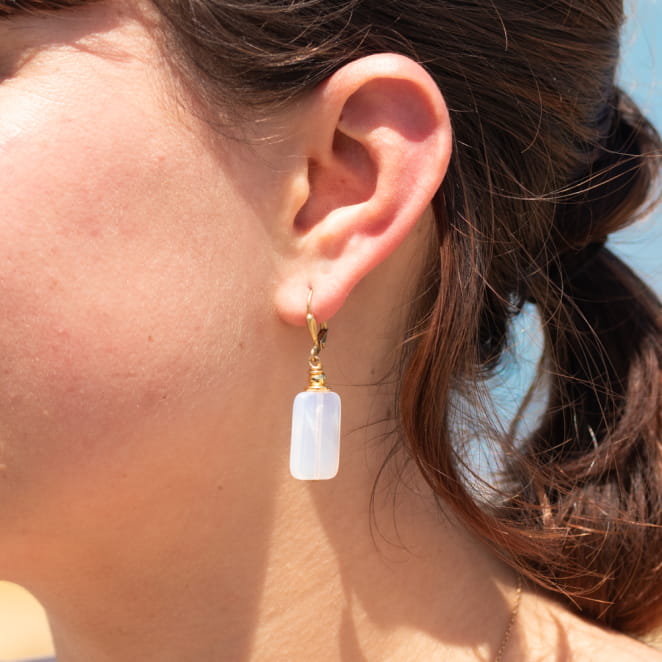 Ces boucles d'oreilles fantaisie Gum, fabriquées à la main, allient l'éclat du doré à la pureté du blanc. Agrémentées d'une perle en verre d'une blancheur laiteuse, elles apportent une touche de classe à chaque tenue, du quotidien à l'occasionnel ! Légères et discrètes, elles conviennent à tous les styles. Découvrez cette création qui marie l'artisanat et l'esthétique raffinée, pour une élégance intemporelle.