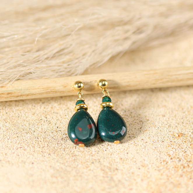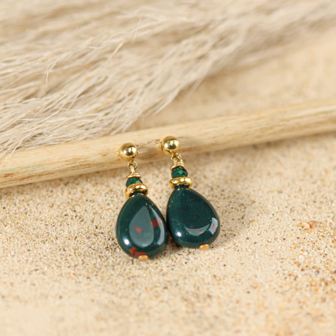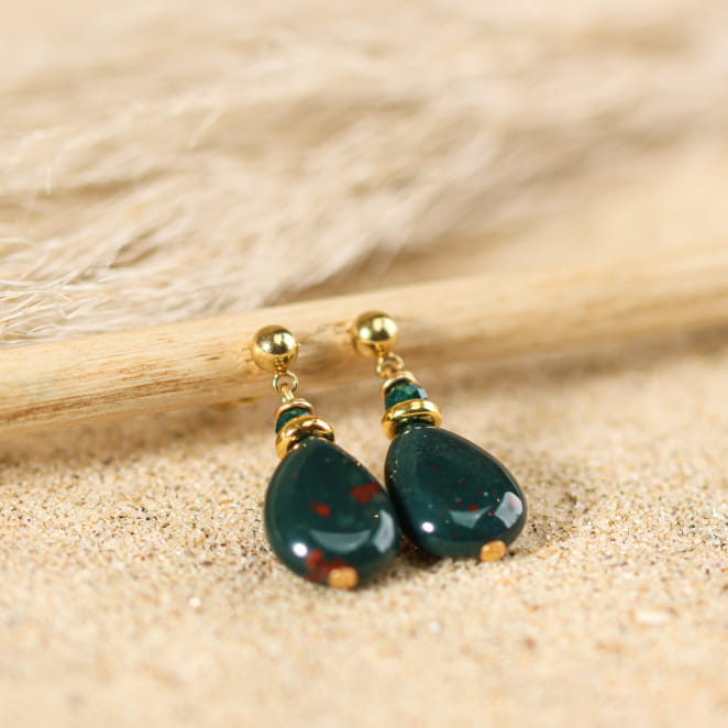 Découvrez notre paire de boucles d'oreilles pour femme Léna. Un bijou composé de perles naturelles et de verre qui se marient parfaitement pour ajouter une touche de délicatesse et de douceur à votre style ! Sa perle verte en jaspe et sa perle en verre apporte avec subtilité une touche de couleur.