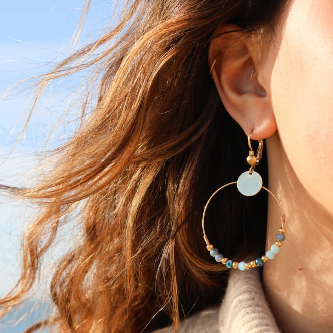 Vous aimez les bijoux colorés ? Alors craquez pour les boucles d'oreilles Saverne. Des créoles au style bohème chic qui illumineront votre visage avec leurs perles aux tons bleus, couleur de l'océan. Un mélange de nuances rêveuses et joyeuses !