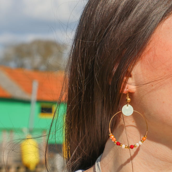 Vous aimez les bijoux colorés ? Alors craquez pour ces boucles d'oreilles Saverne. Des créoles au style bohème chic qui illumineront votre visage avec leurs perles rouge, orange, beige et doré. Un mélange de nuances chaudes et joyeuses !