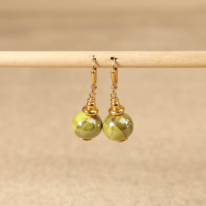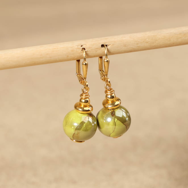 Réchauffez vos journées avec les boucles d’oreilles Sépia, bijou vibrant qui capture la lumière comme un ciel de fin d’été. Leurs perles en céramique vert évoquent le soleil couchant sur l’horizon, tandis que le métal doré ajoute une touche d’éclat. Une composition lumineuse, au charme solaire, pour illuminer votre visage d’un soupçon de chaleur. Légères et rayonnantes, ces boucles subliment toutes les carnations et apportent une note chaleureuse à vos tenues !