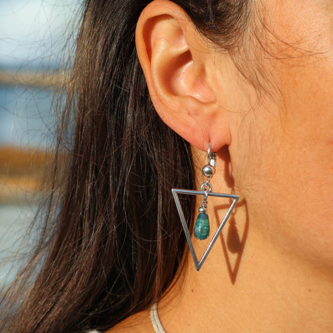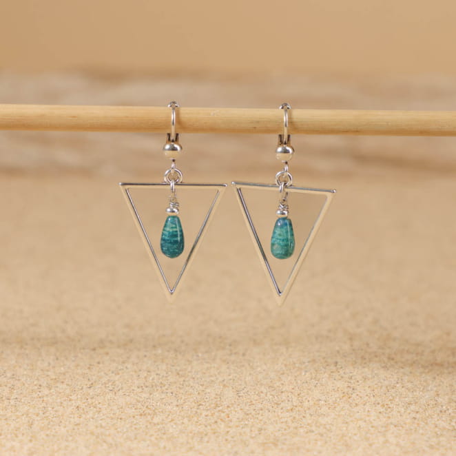 Les boucles d'oreilles Trigo dévoile de belles gouttes en apatite bleu pétrole qui sauront sublimer votre cou. Ces dormeuses argentées sont idéales pour accompagner tous vos looks du quotidien.