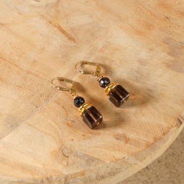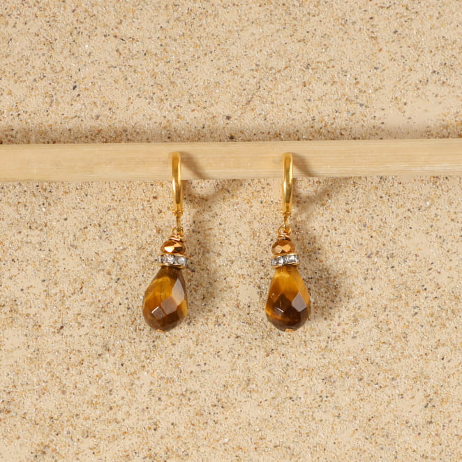 Optez pour nos boucles d'oreilles femme Witch : les perles œil-de-tigre révèlent leurs reflets dorés et chauds, sublimées par des perles en strass et une perle de verre marron profond. Ce bijou, à la fois puissant et délicat, reflète les jolies couleurs des pierres naturelles et la lumière des côtes sauvages.