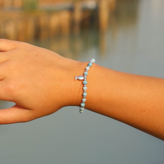 Laissez-vous séduire par la douceur et la fraîcheur du bracelet Alexia. Ce bijou associe des perles en verre bleu ciel et en larimar, pierre naturelle aux nuances délicates évoquant le ciel clair des beaux jours. Des perles argentées apportent une touche d’éclat, tandis qu’un pendentif poisson argenté, vient terminer le bracelet avec douceur. Léger et raffiné, il se porte facilement au quotidien, seul pour un rendu délicat ou combiné à d’autres bracelets pour un look plus affirmé.