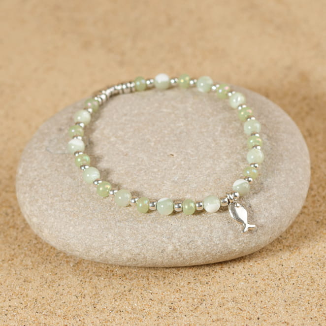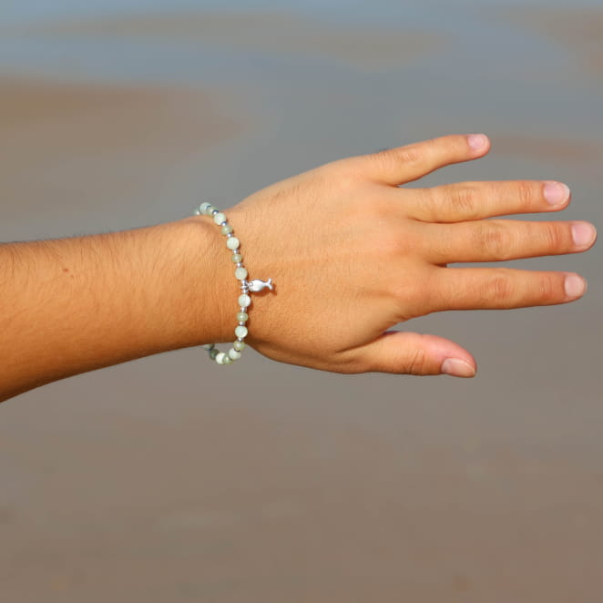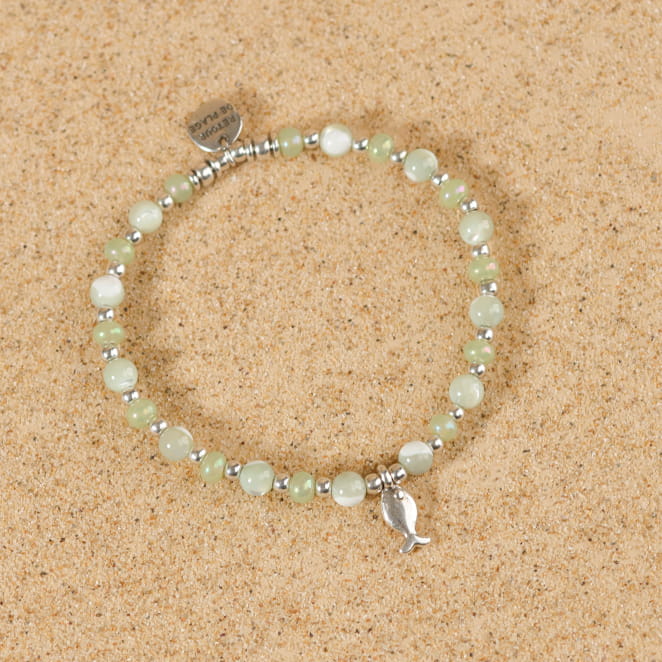 Notre bracelet pour femme ne perles Alexia se pare d’un éclat argenté délicat, sublimé par des perles vertes aux reflets lumineux. L’association du métal argenté et de la couleur verte évoque la fraîcheur des vagues et la vitalité de la nature. Son pendentif poisson argenté complète ce bijou au charme marin, à la fois élégant et intemporel.