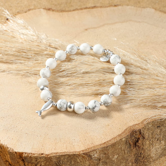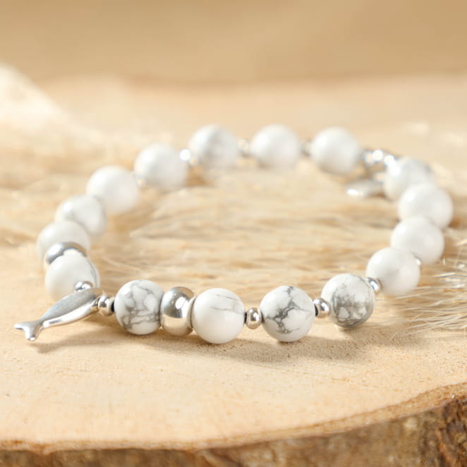 Notre bracelet pour femme en perles : Aquarium, reflète toute la beauté du bord de mer. Ses petites perles argentées captent la lumière avec éclat, tandis que les perles naturelles en howlite brillant apportent une touche lumineuse. Le pendentif argenté en forme de poisson évoque une note marine nous rappelant l'univers marin, symbole emblématique de l’océan, ajoute de l'originalité à votre tenue. Notre bracelet pour femme est un intemporel qui habille le poignet d’une touche marine subtile.