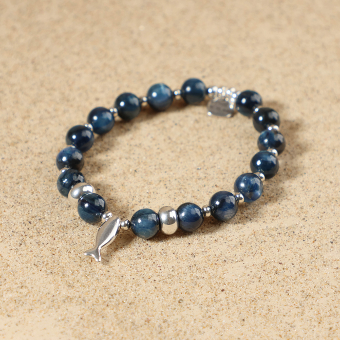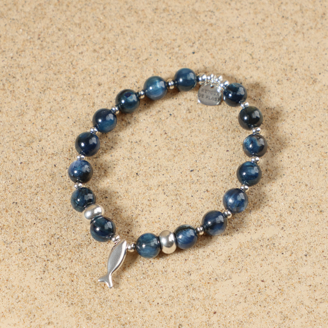 Notre bracelet pour femme en perles : Aquarium, reflète toute la beauté du bord de mer. Ses petites perles argentées captent la lumière avec éclat, tandis que les perles naturelles en cyanite bleu apportent une touche lumineuse. Le pendentif argenté en forme de poisson évoque une note marine nous rappelant l'univers marin, symbole emblématique de l’océan, ajoute de l'originalité à votre tenue. Notre bracelet pour femme est un intemporel qui habille le poignet d’une touche marine subtile.