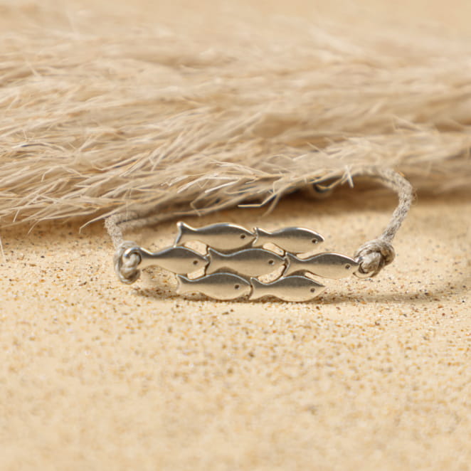 Quoi de mieux que ce bracelet Banc pour vous rappeler vos vacances passées en bord de mer ? Symbole de Retour de Plage, les poissons argentés et le cordon en lin naturel vous permettent de vous évader tout en apportant une délicate touche marine à votre poignet.