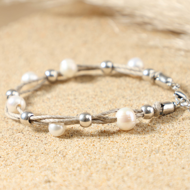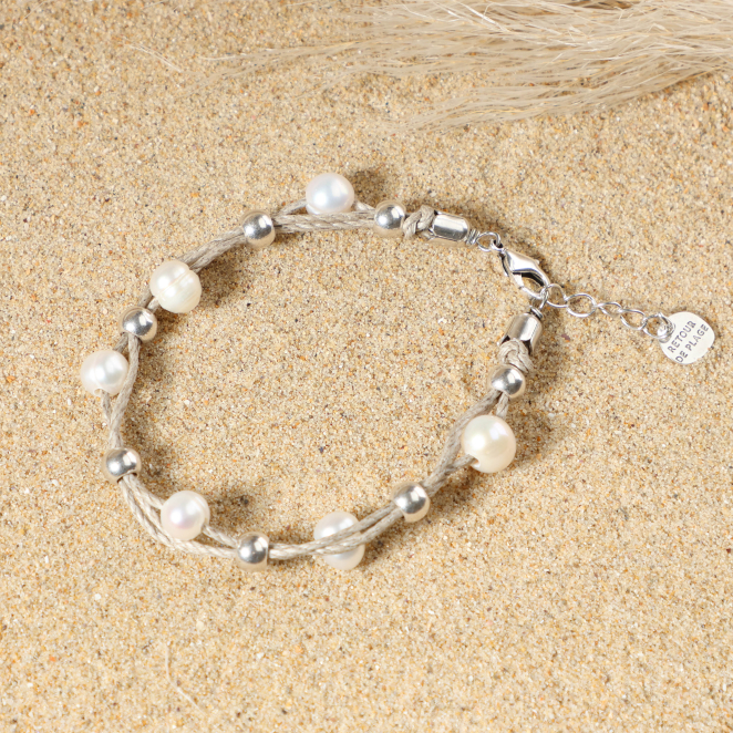 Découvrez le bracelet cordon pour femme Bréhat, une élégance naturelle à vos poignets ! Composé de cordons en lin beige ornés de perles en métal plaqué argent et de perles de rivière blanches, il allie raffinement et simplicité. Parfait pour une touche de sophistication discrète, ce bijou sublime votre style avec une note bohème et chic.