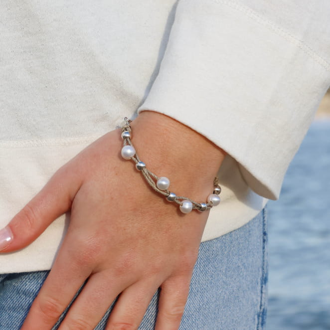 Découvrez le bracelet cordon pour femme Bréhat, une élégance naturelle à vos poignets ! Composé de cordons en lin beige ornés de perles en métal plaqué argent et de perles de rivière blanches, il allie raffinement et simplicité. Parfait pour une touche de sophistication discrète, ce bijou sublime votre style avec une note bohème et chic.