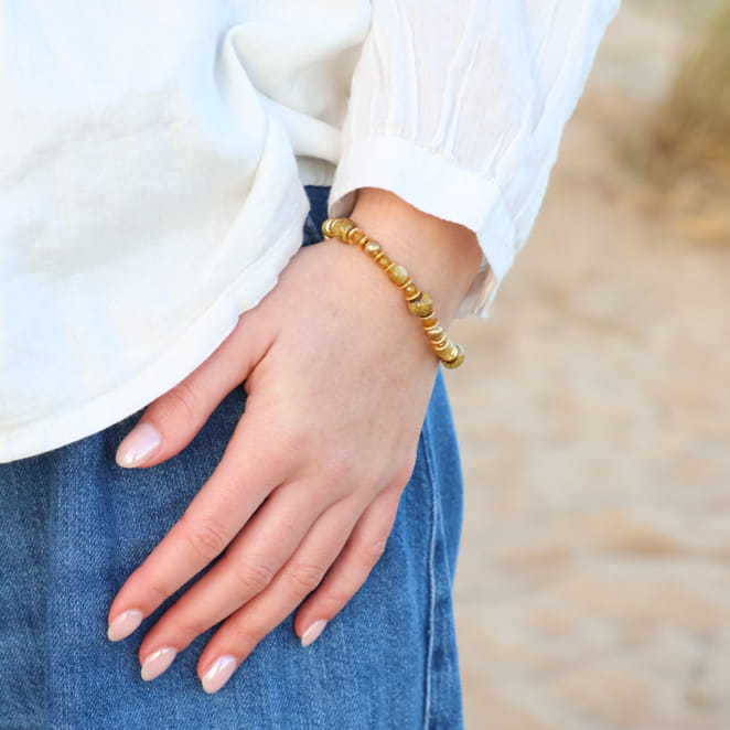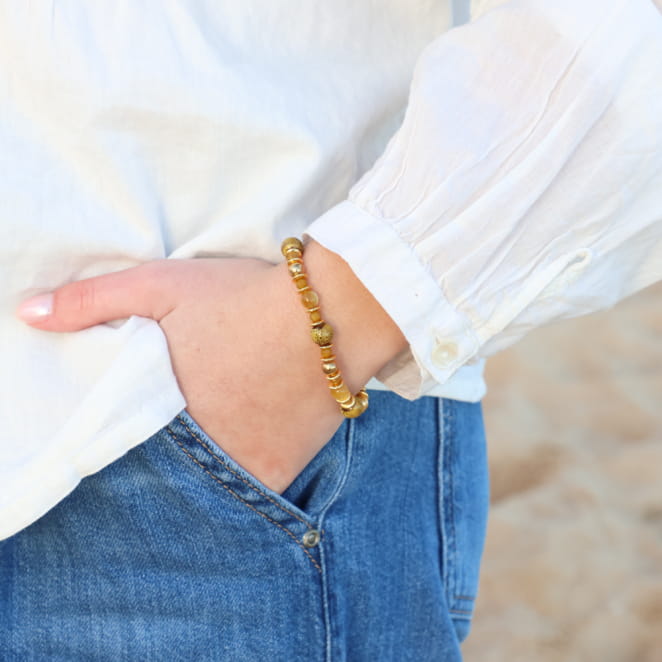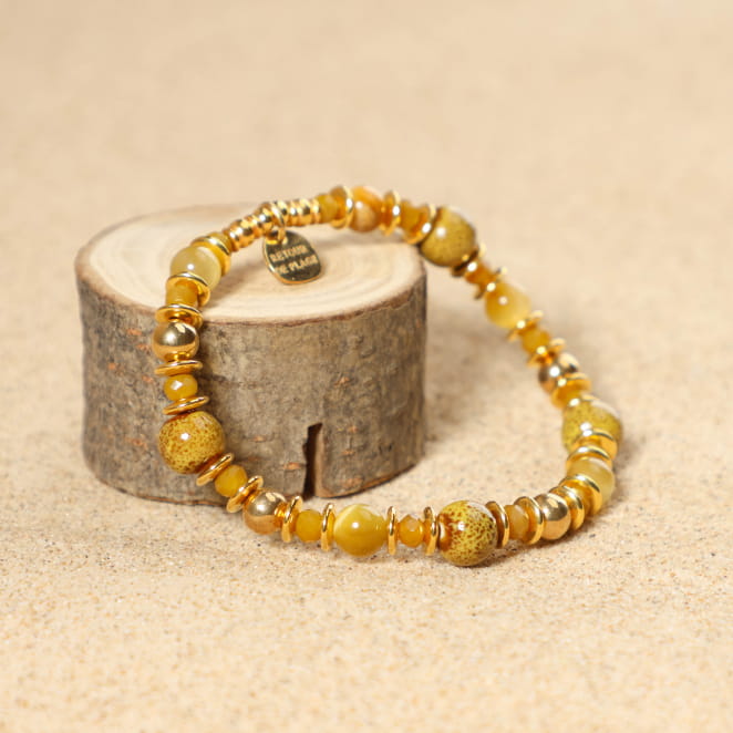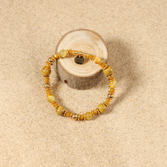 Adoptez le bracelet Elounda, création exclusive de notre e-shop. Confectionné à la main sur l’île d’Oléron, il marie oeil de tigre jaune, verre et céramique, sublimés par des touches dorées inspirées des reflets du soleil. Grâce à son fil élastique, il s’ajuste parfaitement à votre poignet. Un bijou unique, symbole de voyage, de lumière et d’élégance naturelle, à porter seul ou en accumulation pour un style éclatant.