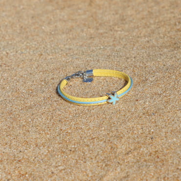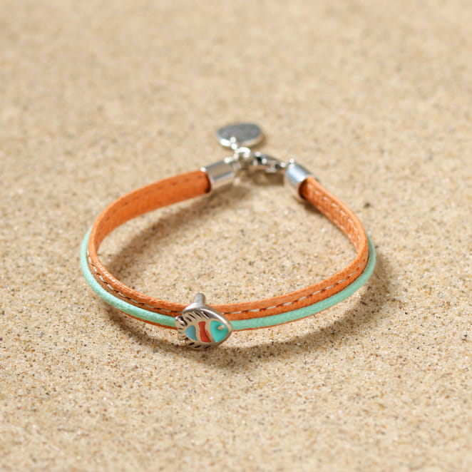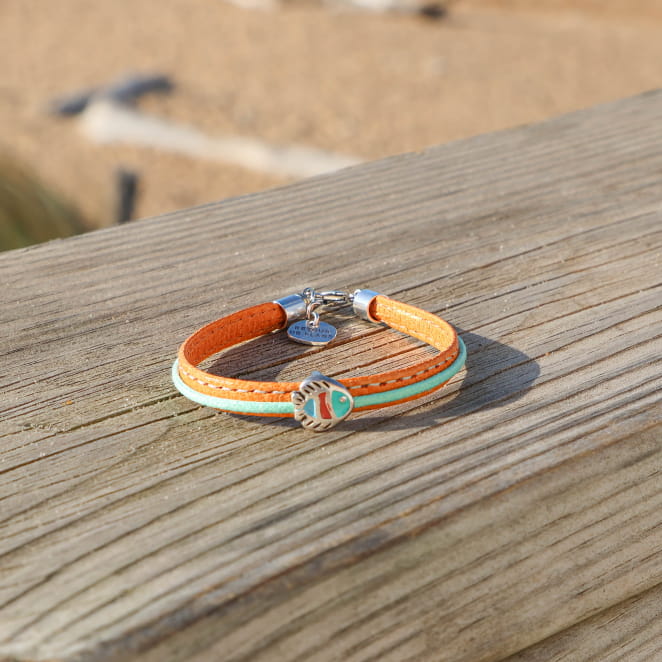 Notre bracelet pour enfant Imeo a été pensé pour accompagner les petits rêveurs d’océan. Son cordon en coton vert s’allie à un ruban en cuir orange pour un contraste joyeux et original. Tandis que le pendentif en forme de poisson argenté etcoloré apporte une touche ludique et marine, parfaite pour un bijou enfant à la fois coloré, léger et facile à porter au quotidien !
