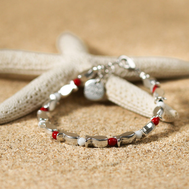 Offrez à votre enfant une touche de fantaisie bayonnaise avec le bracelet Kelele. Conçu avec des perles en verre rouge et blanc et des perles poisson argenté, ce bracelet évoque un monde de jeu et d'aventure. Parfait pour les petites fashionistas en herbe, il ajoute une note de couleur et de charme inspirée de Bayonne à chaque tenue.